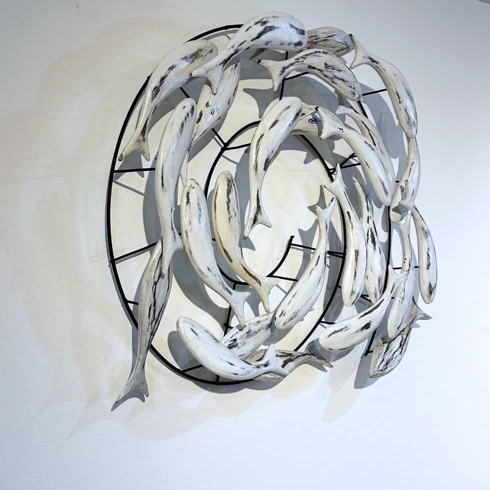 まるで壁に魚の群れが寄ってきたかのようなおしゃれなウッドアート。